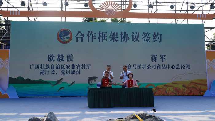 10月18日,广西稻渔与大水面生态渔业交流会暨“广西库库魚”区域公用品牌发布活动利用实时连线与深圳分会场同步联动、实时推介。发布会上,广西自治区农业农村厅与盒马深圳公司签订了农产品合作框架协议,广西大水面养殖企业与京东及各地采购商签订了采购销售协议,推动“广西库库魚”走向全国市场。