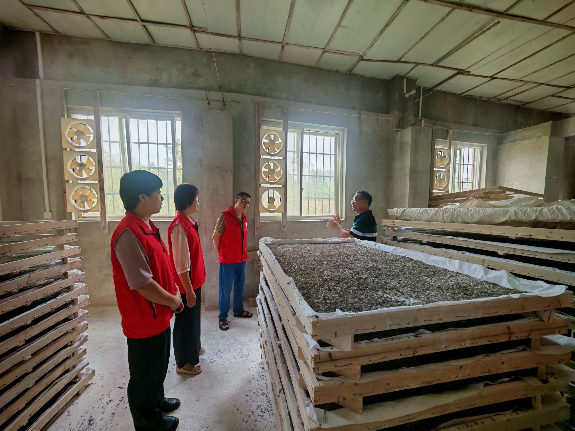 在柳城县工厂化养蚕试验基地,浦月霞团长与柳城团成员详细查看了共育设施运行现状,并与试验基地技术顾问韦相立就小蚕共育发展过程中面临的关键问题进行了深入交流。韦相立结合自身多年养蚕实践指出,现有小蚕共育设施在提升喂养效率与小蚕质量方面仍有较大改进空间,并分享了其通过持续改造蚕房以优化生产条件的经验与成效。