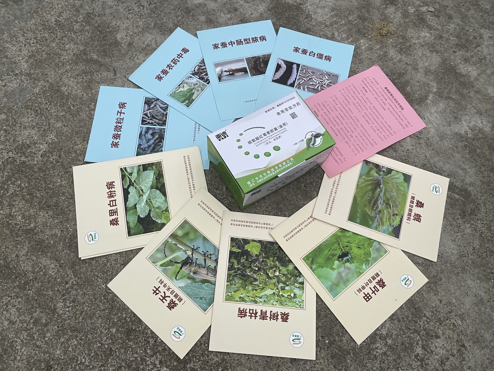 技术团队给蚕农发放病虫害防治手册与蚕业相关药剂