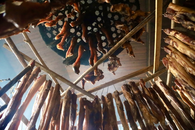 腌制好的本地土猪肉、土鸡悬挂在熏烤架上,以茶籽壳、甘蔗渣为燃料慢火熏烤,让腊味充分吸收香气,最终形成色泽褐红、肥瘦分明、腊香醇厚的独特风味。