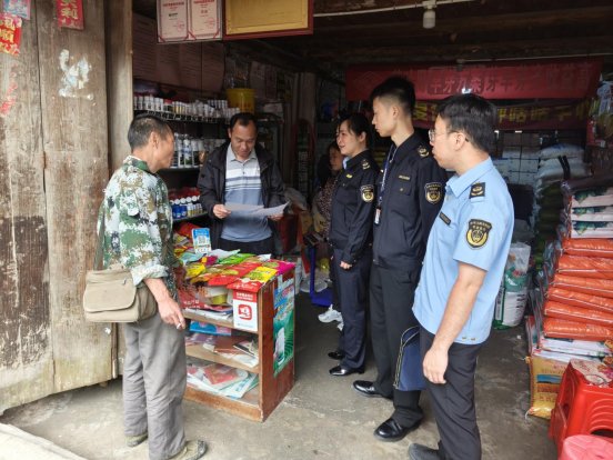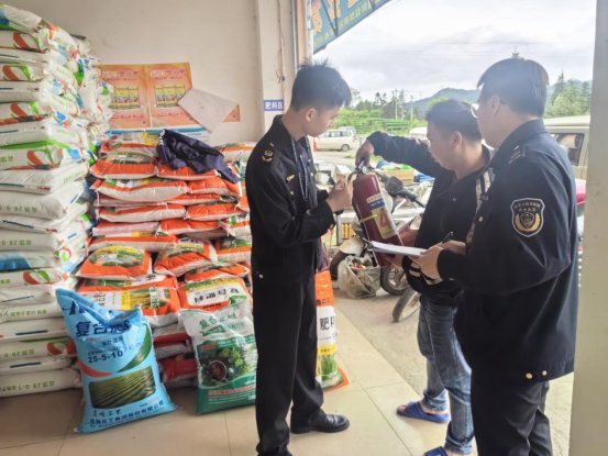 农业综合执法人员向农资经营企业执法人员向农资经营店发放《禁限用农药目录清单》,并对农资经营门店消防安全设备进行检查