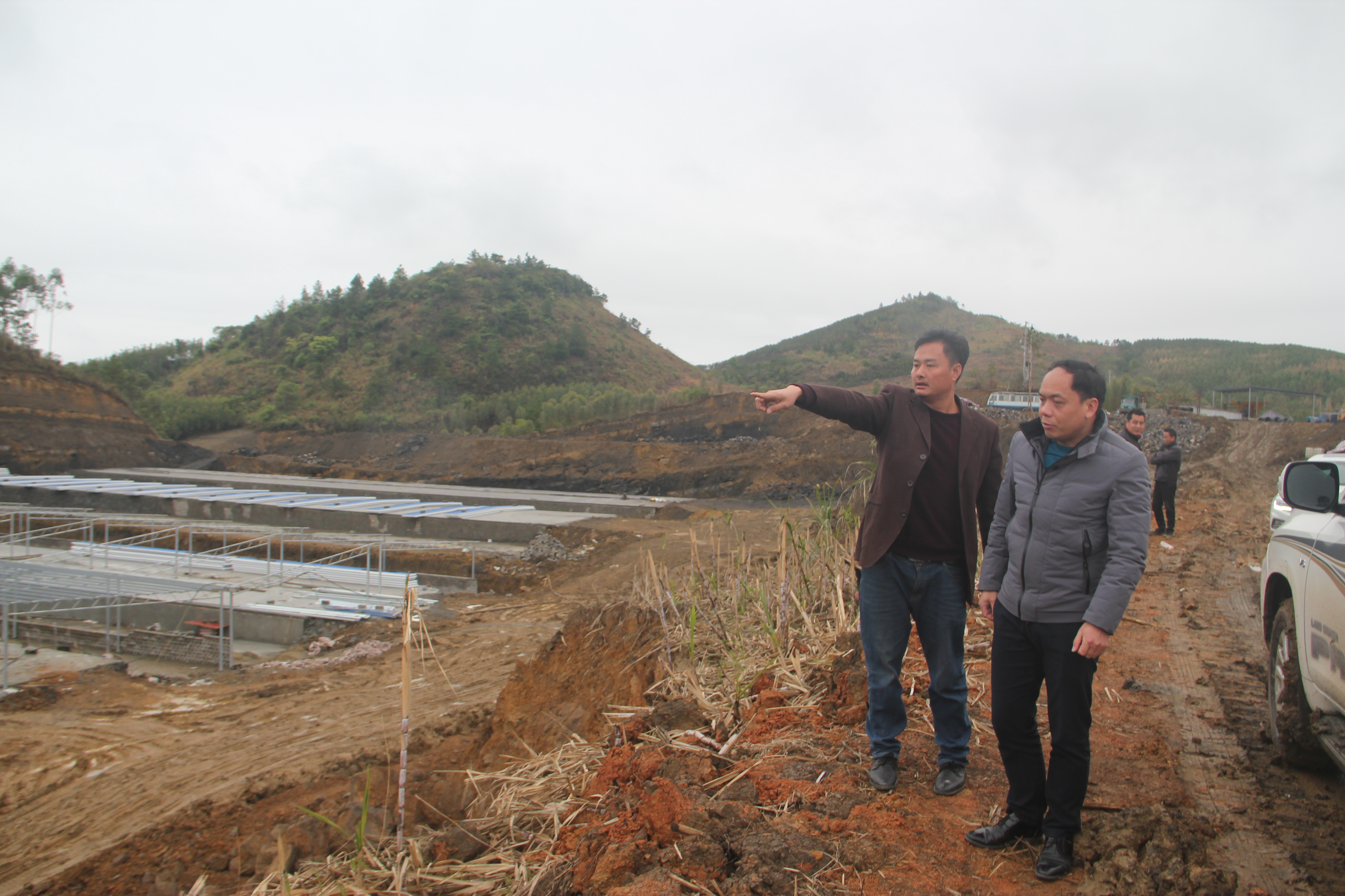 融安县农业农村局畜牧站技术员在潭头乡何洞村指导新建生猪规模化养殖场建设