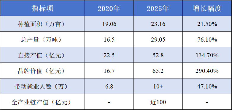 表1:融安金桔产业发展主要指标对比(2020年—2025年)