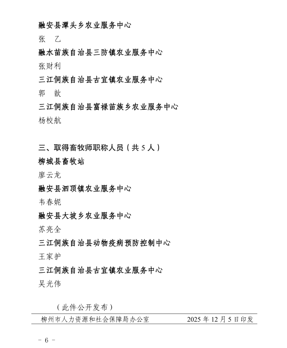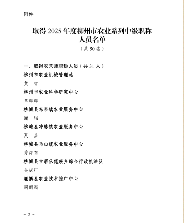 柳人社函〔2025〕75号关于确认黄智等50名同志取得2025年度农业系列中级职称的函