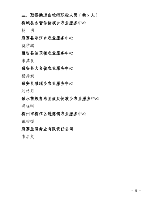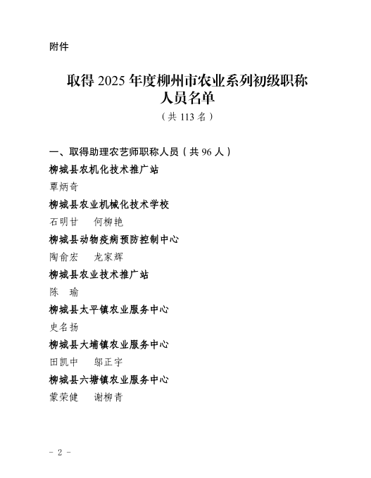 柳人社函〔2025〕76号关于确认覃炳奇等113名同志取得2025年度农业系列初级职称的函